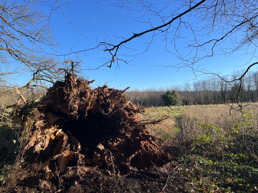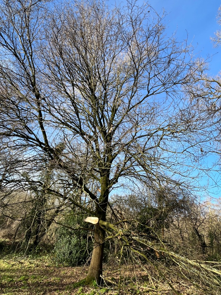 As I approached Moreland’s Meadow, I found myself getting tense. I realised, I was worried about the stand of very mature oaks and the single massive chestnut just beyond the stile. Thankfully most were still standing. But a number of the oaks at the edge or further out in field had either fallen, or were badly injured, their torn limbs and exposed heartwood searingly visible from a distance. All I could do was walk among them, touch their bark and whisper “sorry”. It felt like the loss of old friends. Another woman walking her dog stopped to commiserate with me. “I knew you were upset by your face,” she said to me, “it’s really sad.”