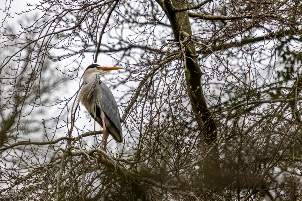 “There’s a scattering of mallards, and a single moorhen attracts my gaze with its jerky head. That reflex movement is suddenly writ large a little further into the tangle of trees. I lift my binoculars for a closer look and meet a yellow glare. For breath the heron’s eye stares fixedly back at me. Then it clearly decides I am harmless and continues about its business.